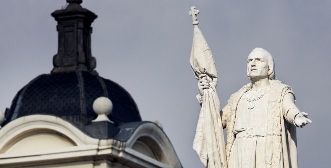 The three-meter tall statue of Christopher Columbus is work of Jerónimo Suñol, carved out of Carrara marble and set atop a high pedestal. Columbus is wearing a tunic and cape and shown holding the flag of Castile, which is resting on a globe in one hand while the other hand is open and outstretched in front of him. The gothic-inspired base features reliefs on all four sides, depicting scenes related with the discovery of America.