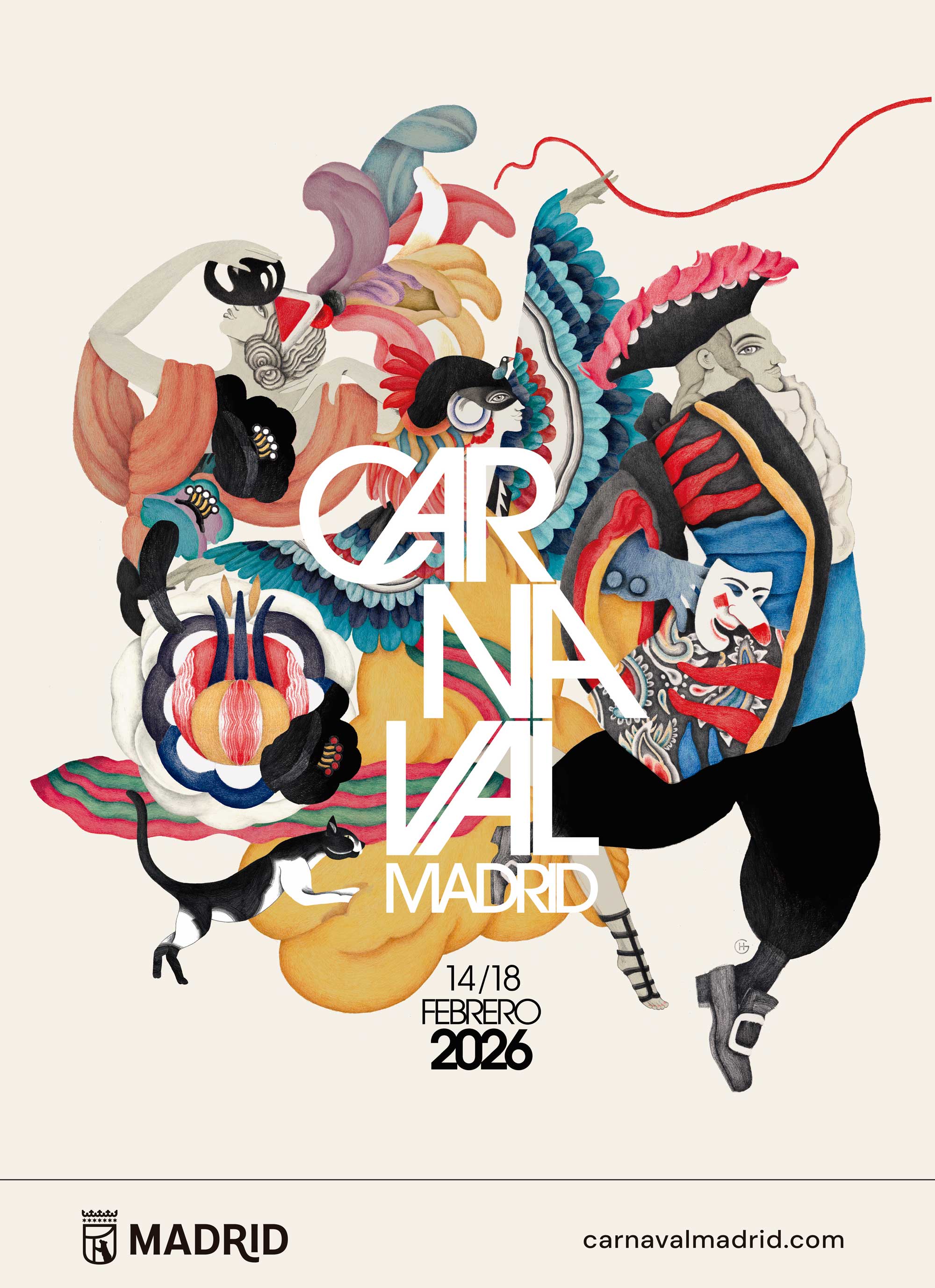 El Área de Cultura, Turismo y Deporte del Ayuntamiento de Madrid facilita la descarga del cartel (JPG. 414 KB) oficial de la campaña de Carnaval Madrid 2026 creado por Carmen García Huerta.