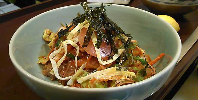 Junto a platos nipones como el sushi, la tempura y el sashimi, se encuentran recetas propias de la gastronomía de Corea, como son el kimchi (col fermentada) o el bibim bab (arroz con verduras y carne). Todo ello en un ambiente relajado y muy agradable.